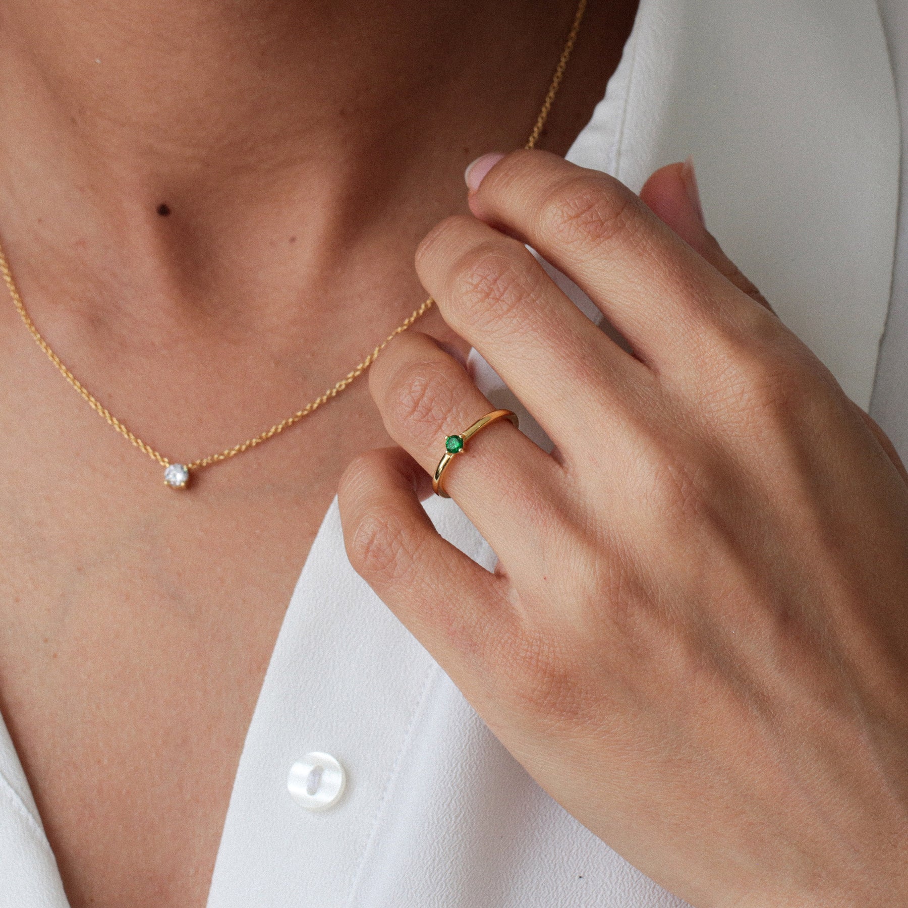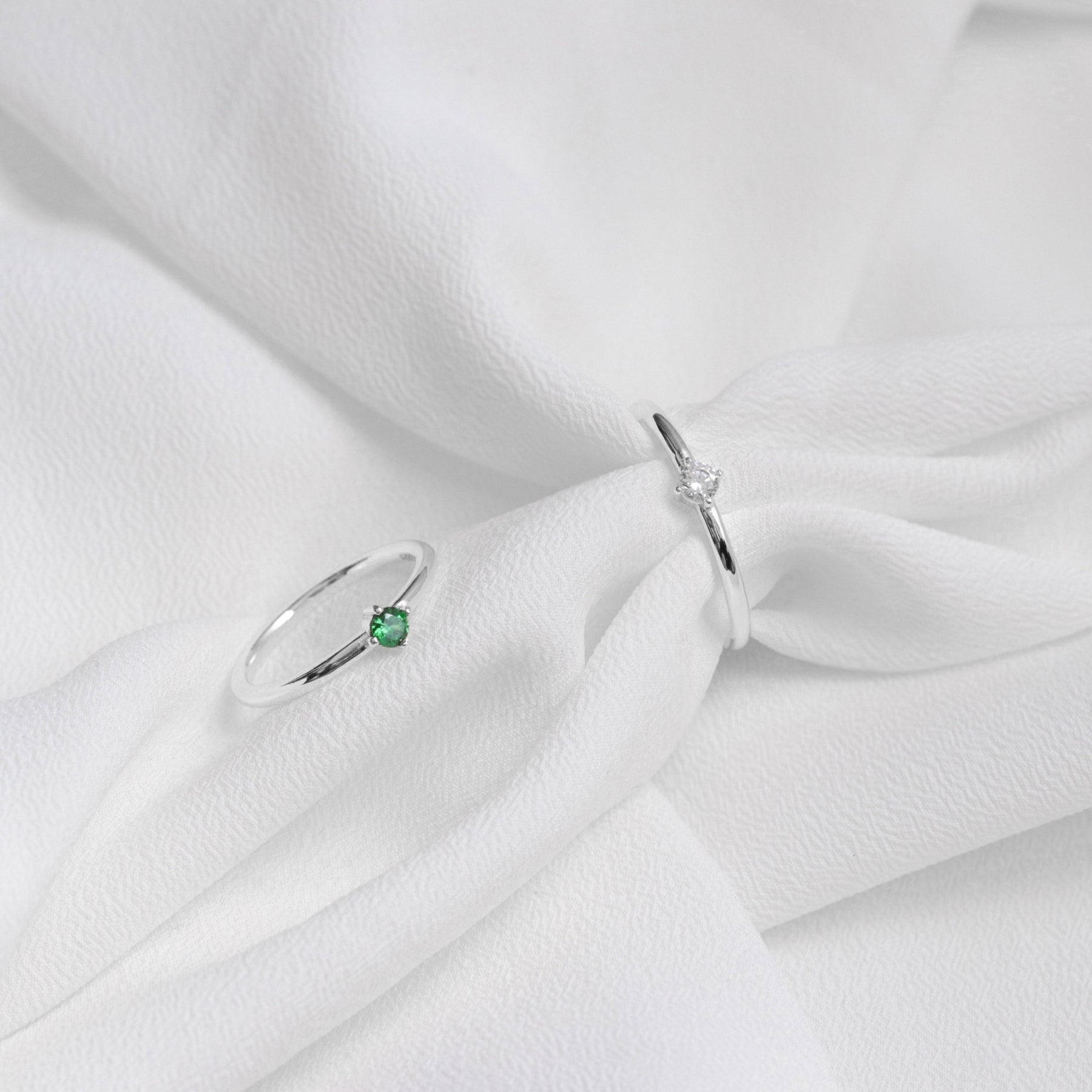 Bague 3mm fabriquée en argent massif et émeraude synthétique (cubic zirconia). Ces bijoux minimalistes sont disponibles en deux finitions : l'argent massif ou l'argent doré à l'or fin 18k pour un éclat supplémentaire.