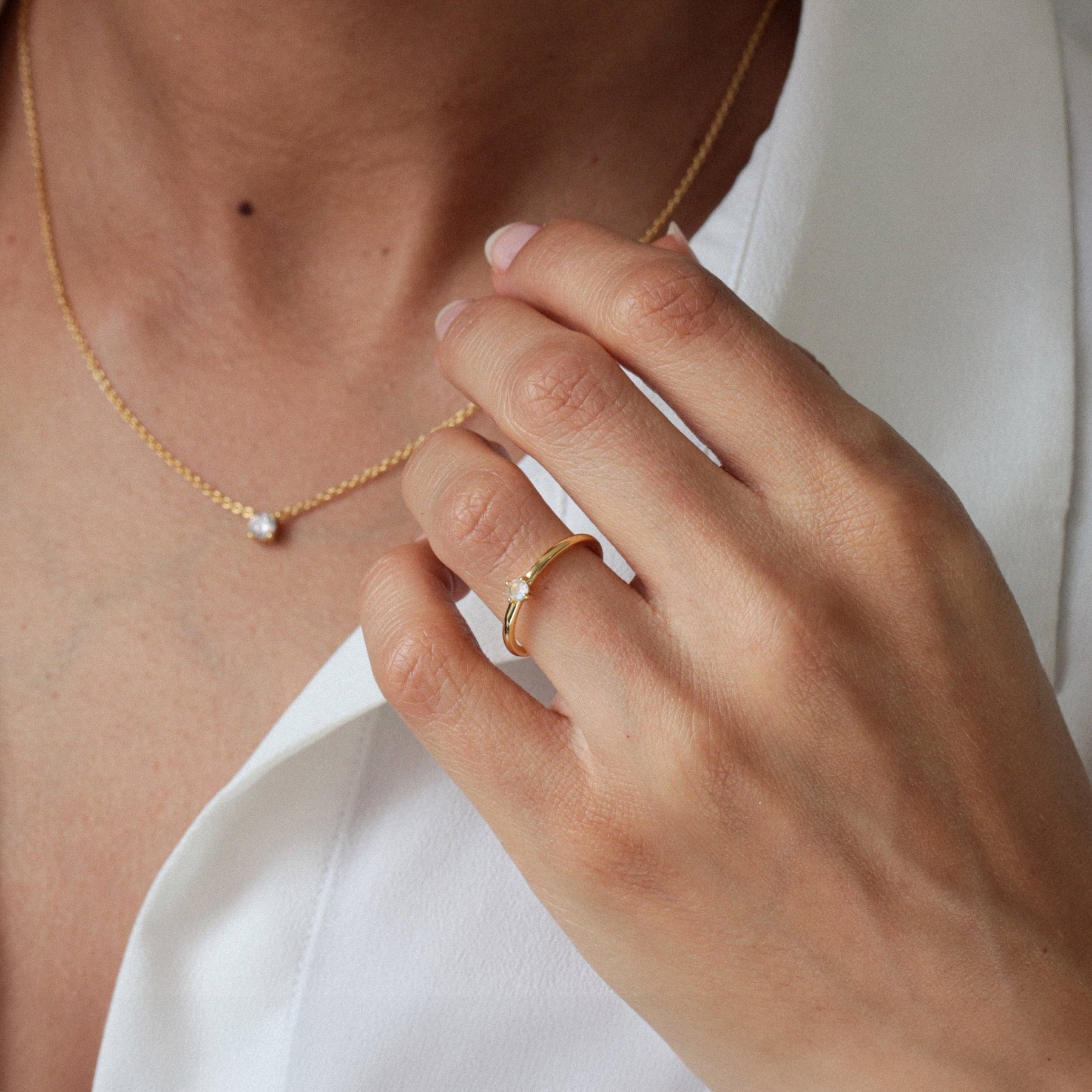 Bague 3mm fabriquée et argent massif et pierre de lune naturelle. Disponible en deux finitions : l'argent massif ou l'argent doré à l'or fin 18k pour un éclat supplémentaire.