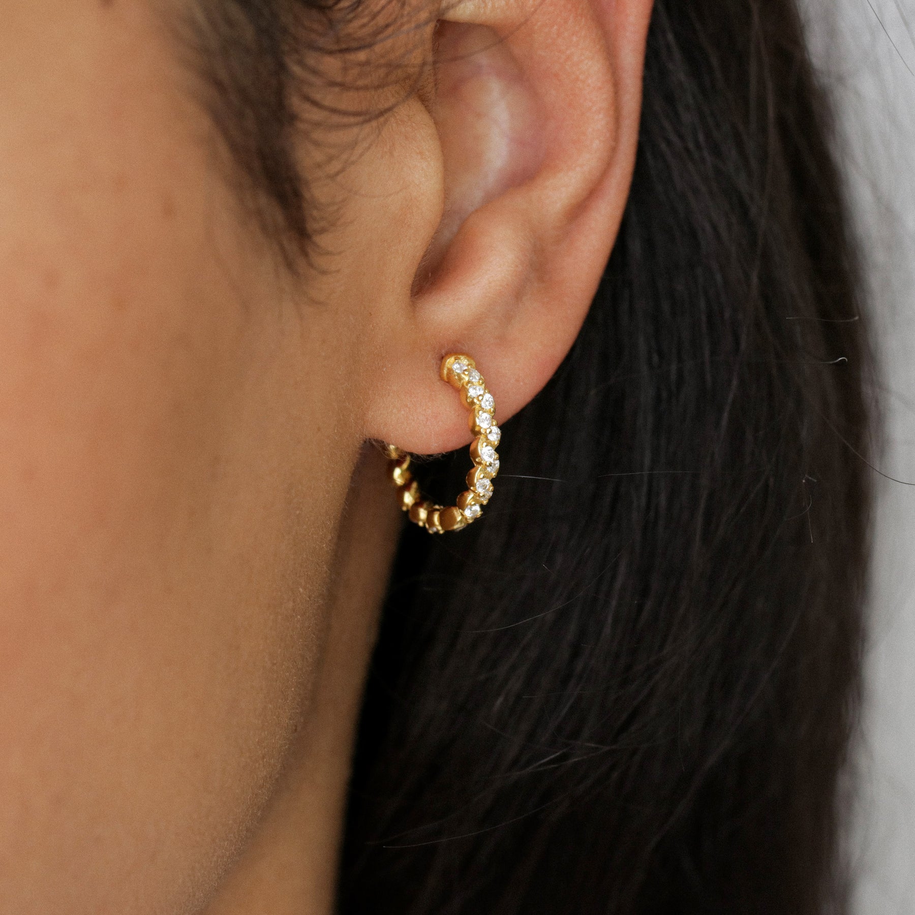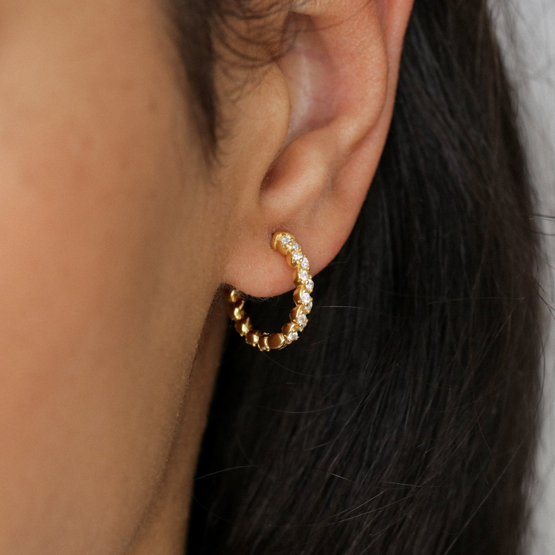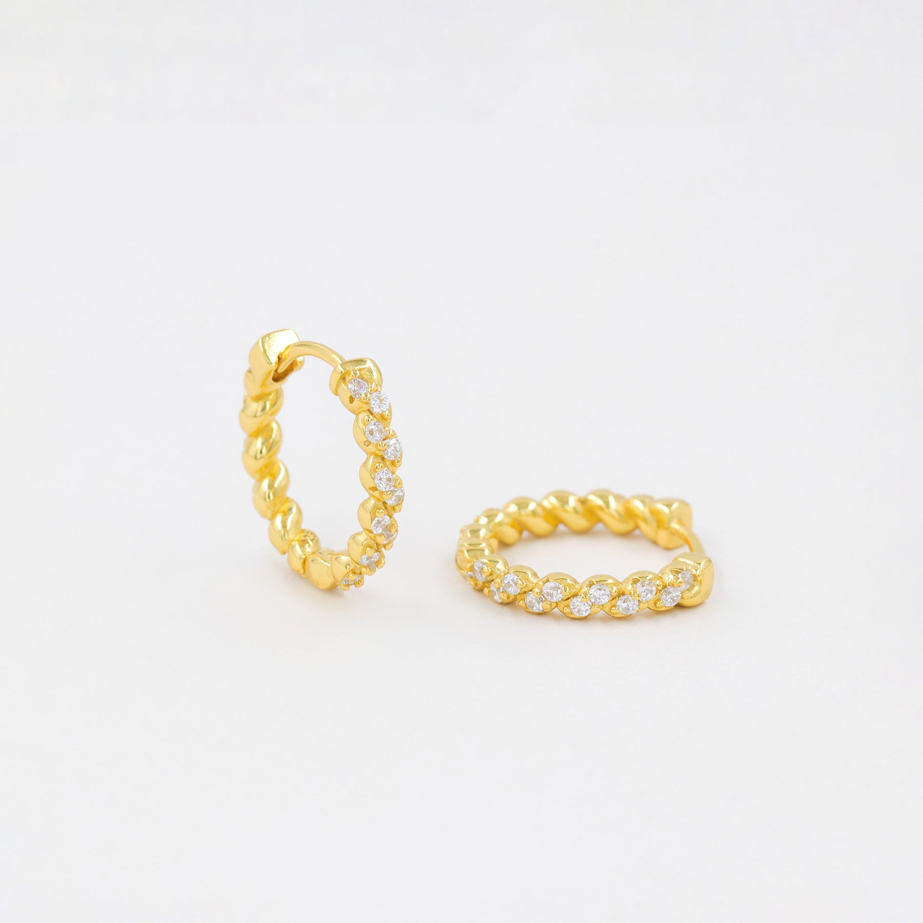 Paire de créoles pavées Amelia fabriquées en argent massif s925 et CZ. Ces bijoux minimalistes sont disponibles en deux finitions : l'argent massif ou l'argent doré à l'or fin 18k pour un éclat supplémentaire.