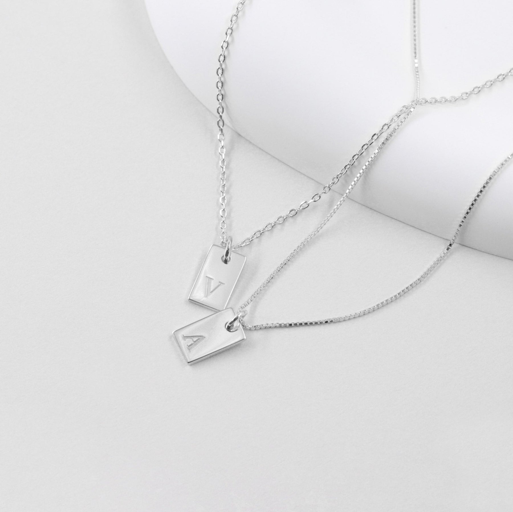 Collier minimaliste Nina fabriqué en argent massif s925. Son pendentif rectangulaire délicatement gravé d’une initiale apporte une touche élégante et contemporaine, parfaite pour un style raffiné au quotidien.