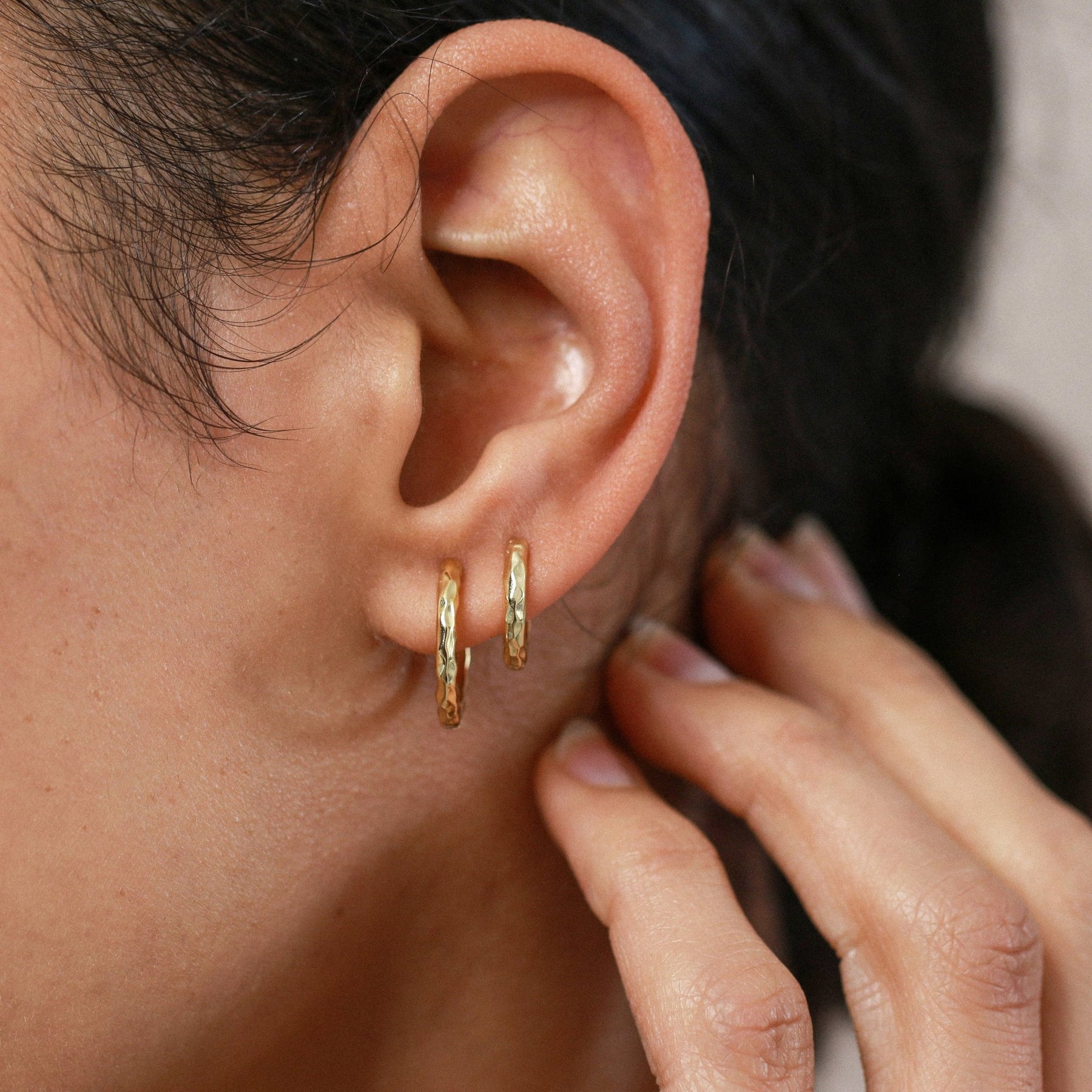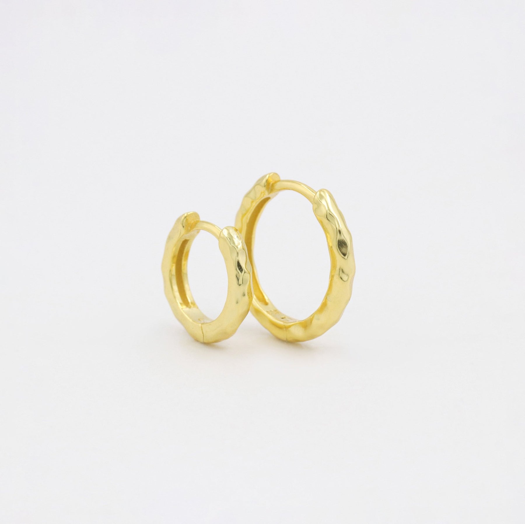 Paire de créoles martelées Inge fabriquées en argent massif s925. Ces bijoux minimalistes sont disponibles en deux finitions : l'argent massif ou l'argent doré à l'or fin 18k pour un éclat supplémentaire.