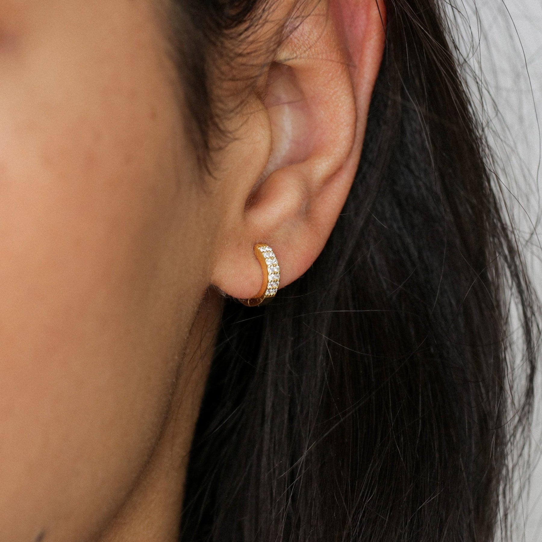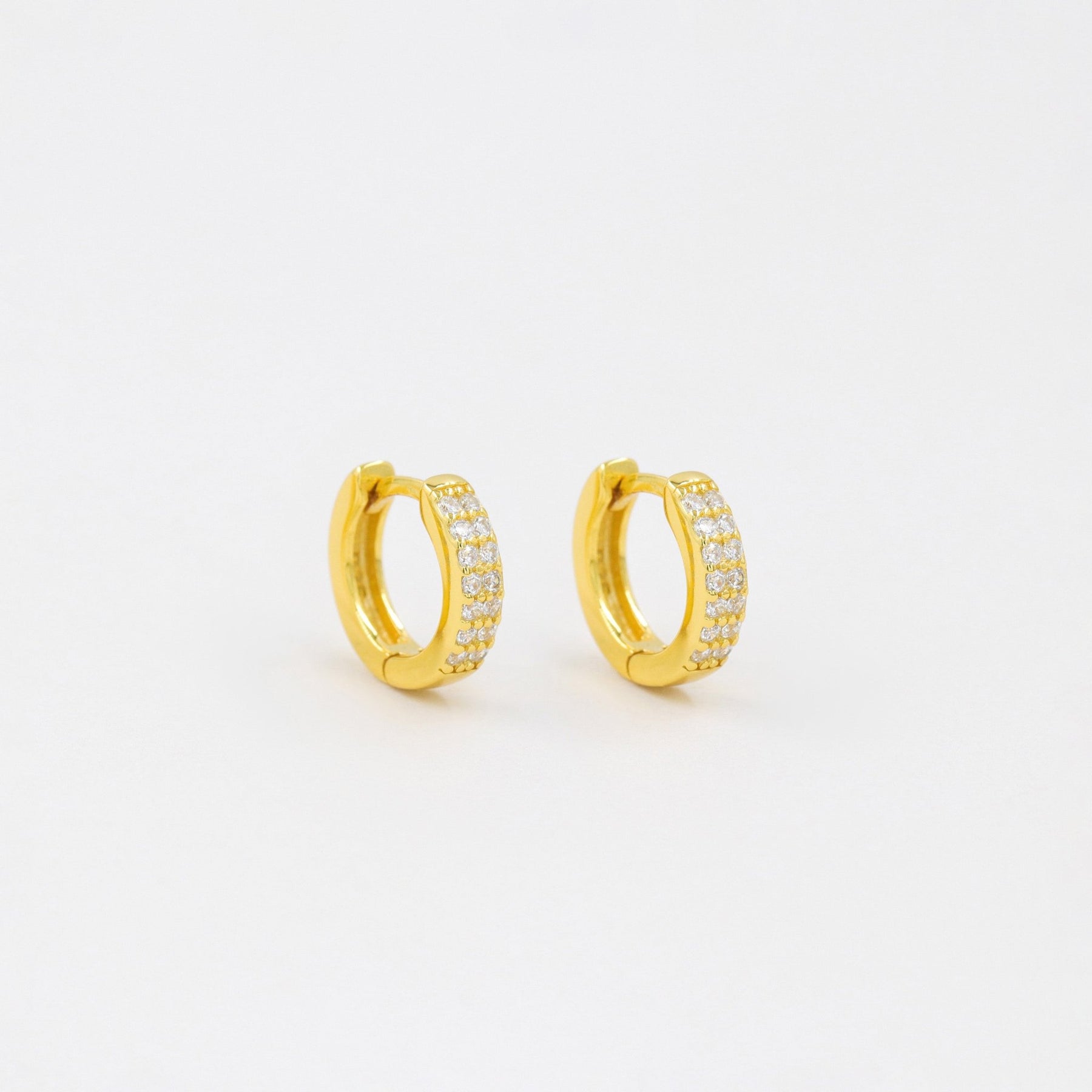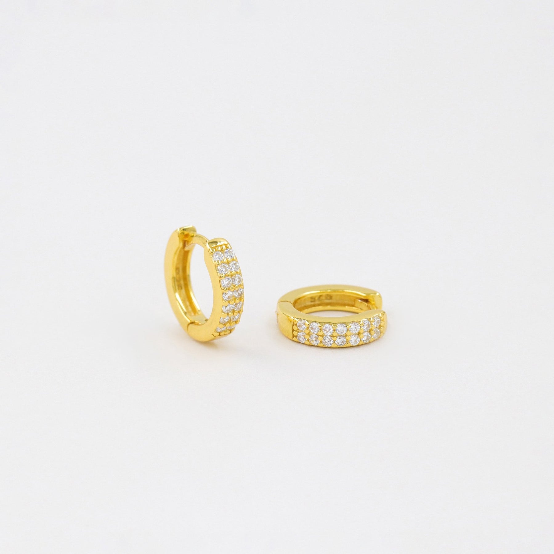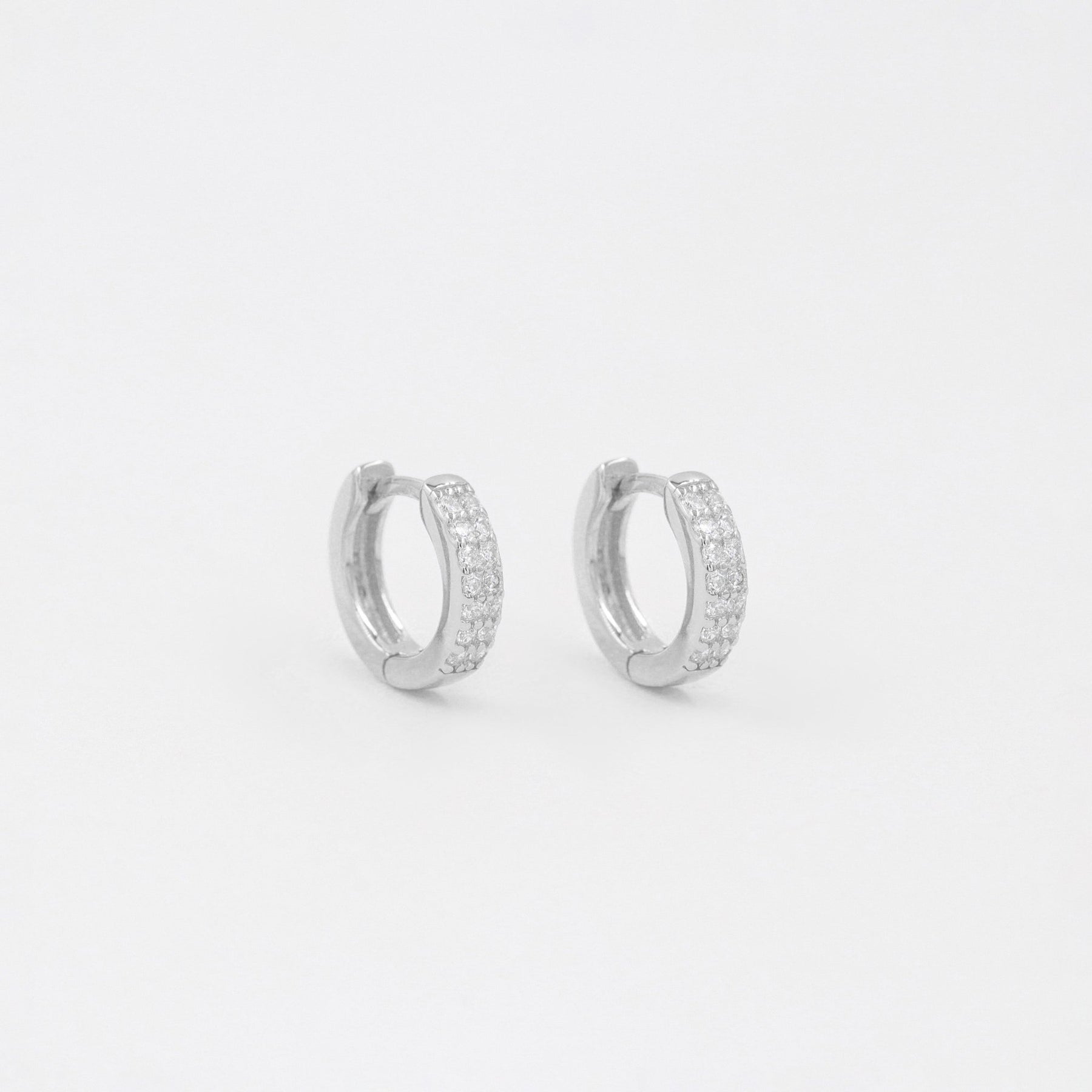 Paire de créoles pavées Mira fabriquées en argent massif s925 et CZ. Ces bijoux minimalistes sont disponibles en deux finitions : l'argent massif ou l'argent doré à l'or fin 18k pour un éclat supplémentaire.